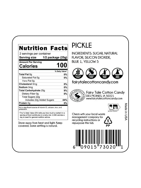 Our pickle cotton candy captures that tart, tangy, mouth puckering feel in a tub of freshly spun cotton candy. You may have seen it trending on Tik Tok!